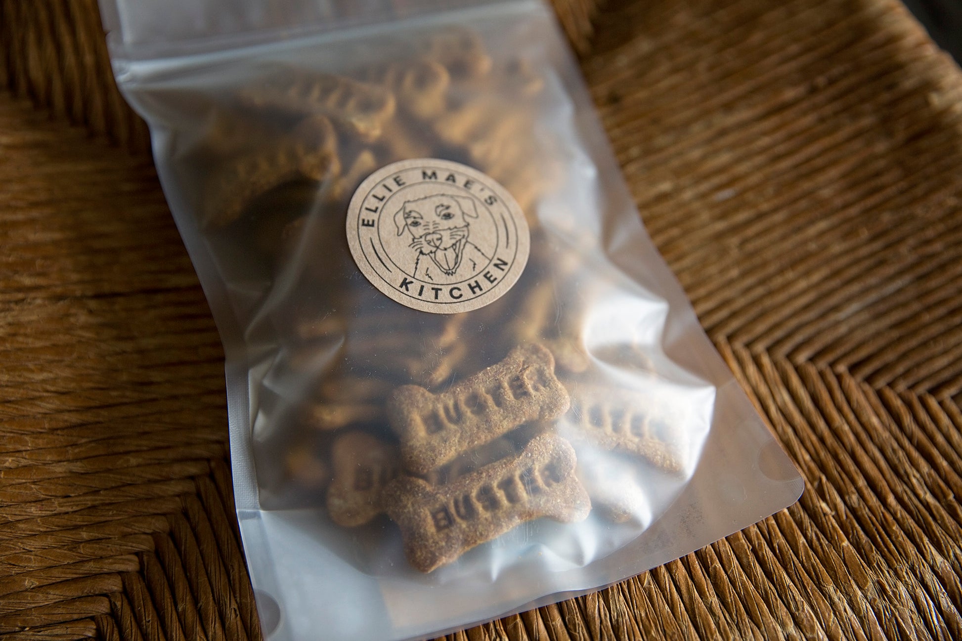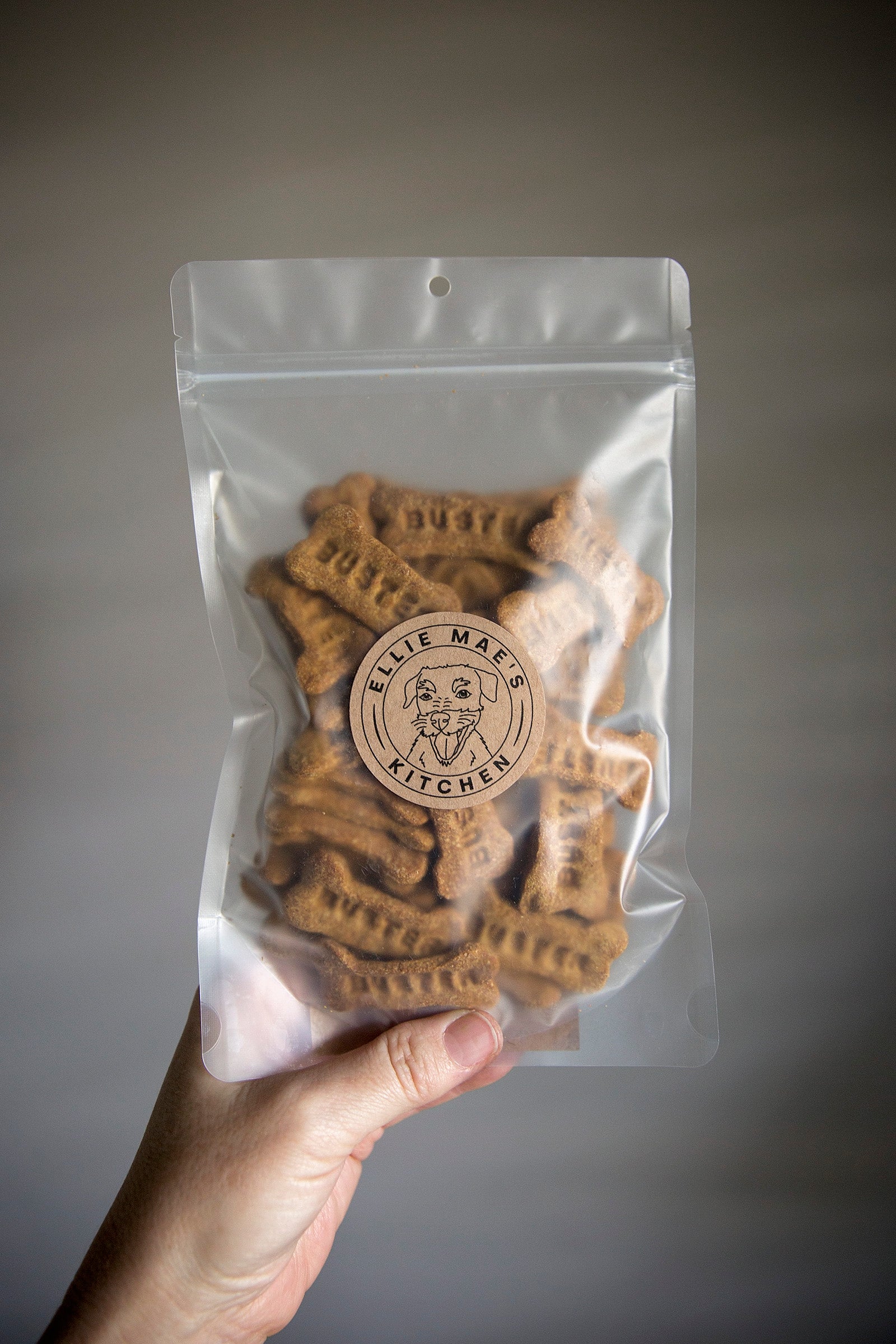 You'll receive a 5 oz bag of bone-shaped treats stamped with your pup's name. Email us at elliemaeskitchen@gmail.com to let us know what name you'd like stamped on your bones - up to 6 characters will fit on these small bones.